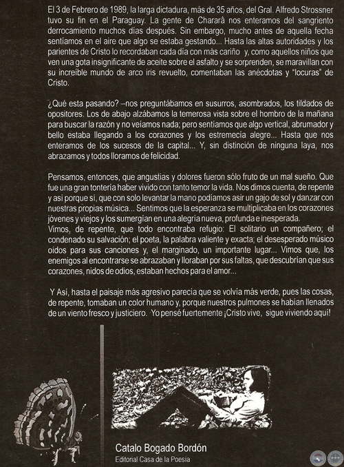 El 3 de Febrero de 1989, la larga dictadura, más de 35 años, del Gral. Alfredo Stroessner tuvo su fin en el Paraguay. La gente de Chararâ nos enteramos del sangriento derrocamiento muchos días después. Sin embargo, mucho antes de aquella fecha sentíamos en el aire que algo se estaba gestando... Hasta las altas autoridades y los parientes de Cristo lo recordaban cada día con más cariño y, como aquellos niños que ven una gota insignificante de aceite sobre el asfalto y se sorprenden, se maravillan con su increíble mundo de arco iris revuelto, comentaban las anécdotas y "locuras" de Cristo.