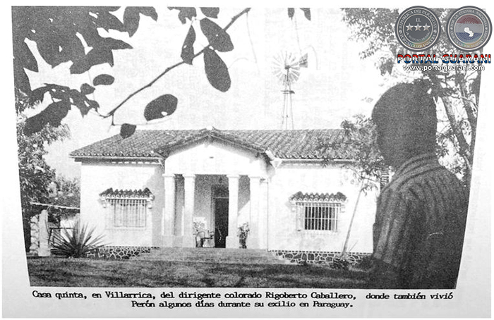 Lo cierto es que al derrocado presidente argentino, una vez llegado a su exilio en Paraguay, por razones de seguridad le asignaron una residencia en la capital del departamento del Guairá, una modesta pero elegante y confortable vivienda de campo, propiedad del señor Rigoberto Caballero, uno de los tantos hijos del general Bernardino Caballero. La misma casa, sita en la periferia de Villarrica, albergaría al papa Juan Pablo II durante su visita a la capital guaireña, en 1988.