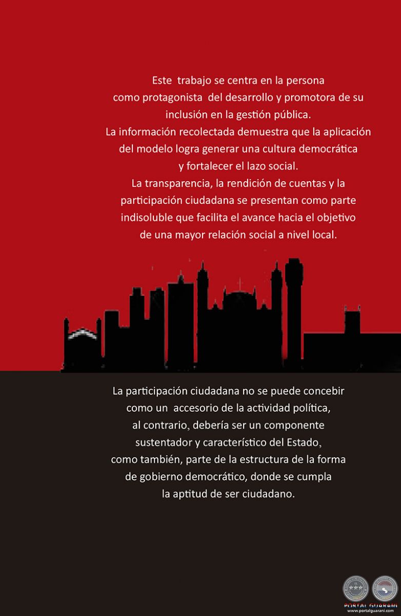 En esta obra, el estimado Jorge Franco nos presenta una visión panorámica pero a la vez profunda de la necesidad de promover una real y cada vez más influyente presencia y participación de la ciudadanía en la gestión de la cosa pública. Su experiencia de años en ámbitos del gobierno local, en contacto permanente y comprometido con las personas, con las organizaciones de la sociedad civil, con grupos vecinales y colectivos ciudadanos se encarnan en páginas de reflexión y proyección sobre una temática central para cualquier sociedad que pretenda alcanzar mejores condiciones de vida para sus integrantes.