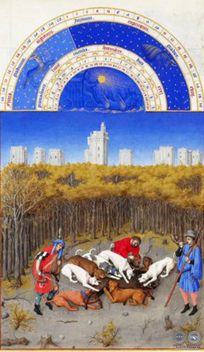 Encargado por Jean, duque de Berry, hacia 1410, y realizado por el taller de los hermanos Limbourg, Las muy ricas horas del Duque de Berry (Les Très Riches Heures du Duc de Berry) es un libro de horas del siglo XV con plegarias para cada una de las horas canónicas del día que se conserva en el Museo Condé de Chantilly, en Francia. La mitad de sus 206 folios están totalmente ilustrados y contiene 131 miniaturas, 300 letras capitales doradas y 1800 cenefas doradas. En su calendario hay representaciones de los meses del año con las labores, generalmente agrícolas, que en cada uno de ellos se realizaban. Hoy, domingo, primer día del último mes del año, saludamos el comienzo de diciembre con la ilustración correspondiente, una escena de montería. Es la parte final de la cacería, que culmina con la entrega de las partes menos nobles de la pieza a los perros. Por eso vemos a los sabuesos en el centro desmembrando al jabalí, mientras, a la derecha, uno de los cazadores toca en un cuerno de caza el «halalí», que proclama que la bestia ha sido abatida. La escena sucede en medio de un bosque; aunque es invierno, los árboles tienen todavía hojas, y en el horizonte se levanta el castillo de Vincennes, que fue terminado por Carlos V, con sus torres y su torreón central, y que, levantado por Luis VII, fue al comienzo un refugio de cazadores. En la parte superior, la carta astral del mes de diciembre nos muestra los signos zodiacales (sagitario y capricornio), las estrellas y el Sol.
