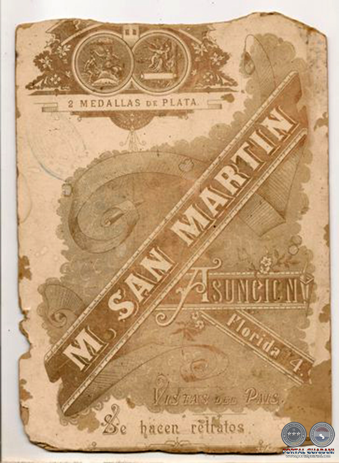 (11) La Democracia, 23/11/1887, p. 1; y el aviso: «SAN MARTÍN/ FOTÓGRAFO/ 14-FLORIDA-14/ De regreso de su viaje a Buenos Aires, participa al público que se encuentra de nuevo al frente de su establecimiento. Posee hoy aparatos de mayores dimensiones y puede servir en el ramo de la fotografía con los más modernos procedimientos./ 14-FLORIDA-14/ Fotografía San Martín». Al dorso de las tarjetas de esta época se lee: «M. SAN MARTÍN/ FOTÓGRAFO/ ASUNCIÓN DEL PARAGUAY/ 14 CALLE FLORIDA 14/ SE HACEN RETRATOS AL LÁPIZ/ AL ÓLEO DEL TAMAÑO MÁS CHICO AL/ NATURAL» y, posteriormente, «PARAGUAY/ 2 MEDALLAS DE PLATA/ M. SAN MARTÍN/ ASUNCIÓN/ Florida 14/ VISTAS DEL PAÍS/ Se hacen retratos».