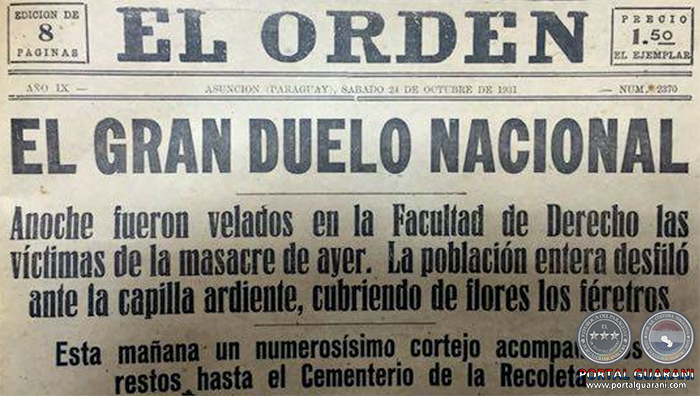 Las movilizaciones ciudadanas continuaron, especialmente con cada noticia que llegaba desde el Chaco. Sin embargo, la más emblemática de todas ocurrió en 1931, cuando ya estaba a la cabeza del gobierno José Patricio Guggiari. El mandatario era resistido por altos oficiales del ejército nacional por rencillas que venían desde la revolución de 1922-1923. También, la propaganda contraria a Guggiari, desde diferentes sectores partidarios, apuntaba a la supuesta indefensión del Chaco. Un hecho vino a encender la llama. El 7 de setiembre de 1931 se produjo un choque en el fortín Samaklay entre tropas paraguayas y bolivianas. Este suceso fue tomado como bandera de protesta por los grupos opositores al gobierno, incluida la disidencia liberal. En la mañana del 23 de octubre una manifestación de estudiantes y obreros se congregó en la plaza Uruguaya. Rápidamente, una columna compuesta casi exclusivamente de estudiantes, alumnos del Colegio Nacional, de la Escuela Normal y de la carrera de Medicina, se lanzó a las calles. Con enseñas patrias, los manifestantes llegaron frente a la explanada de la casa de gobierno, la que se encontraba resguardada por la policía y por efectivos de la Armada Nacional. Minutos después, con los ánimos muy caldeados, intentaron romper la valla. Se luchó a empujones y puñetazos. De pronto, lo inesperado. Las fuerzas de seguridad rompieron fuego sobre la manifestación. Presa del pánico, la muchedumbre solo atinó a arrojarse al suelo. Murieron 11 personas, y cayeron decenas de heridos. Ante lo sucedido, el presidente Guggiari se puso a disposición del parlamento para someterse a juicio político, del que resultó absuelto.