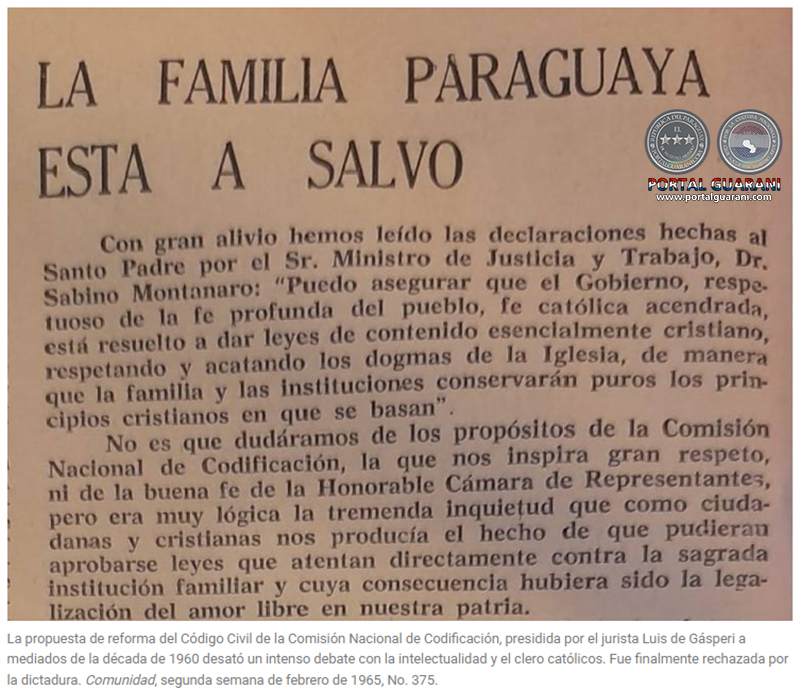 En los primeros años de instauración en el Paraguay del matrimonio civil, se desató una puja abierta entre el Estado y el clero católico. En una carta pastoral publicada en 1898, monseñor Juan Sinforiano Bogarín definía a la familia como una institución “a la vez natural, religiosa y social”. Estos tres atributos se interrelacionan: es natural, porque “el Autor de la naturaleza” la estableció como medio “para alcanzar la reproducción humana”; religiosa, porque “Dios la ha constituido, bendecido y consagrado en la primera pareja que le sirve de tipo” y social, porque en ella “nacen los individuos que forman la sociedad y también se originan consecuencias sociales”.