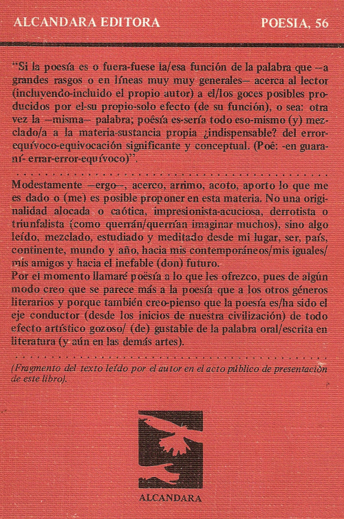 Toda producción tiene o tendrá un (su) destino y todo reconocimiento, aún y más por encima de diferencias, distancia o pareceres es atributo in-dis-pensable de todo (¿buen?) ser humano (o 'cristiano' al decir de la gente). No pretenderé ser ni tan bueno ni tan reconocido-reconocedor pues mi estirpe y mi sangre no parecen destinarme ese presagio; pero al menos diré, que la alcandarización de la poesía paraguaya, una cuasi-épica significativa del romancero nativo (con 50 títulos s publicados a la fecha), en esa nada- terra-ignota-ignara como lo fué siempre y es toda poesía y más en un país tan aleja-do como el nuestro, y en un género y oficio tan a con-trapelo de la historia, las cosmovisiones-pretensiones-pillajes-ultrajes-prisiones y presiones de esta rara-desquisiada especie-raza humana, en estos años epilogales de un fatídico siglo XX o en los umbrales más que evidentes de la conculcación y finiquito sin tanta gloria de lo que se considera vulgarmente dos milenios de la mayor civilización datada: repito, sostengo y afirmo que la hazaña y el afán del editor-maestro-amigo y poeta Carlos-Carlitos Villagra Marsal de o por construir, rescatando el basamento de la poética paraguaya, es-vale y no será -para el futuro- el puro canto-kanto desvelado de una guarania que se lleve-llevará el viento.