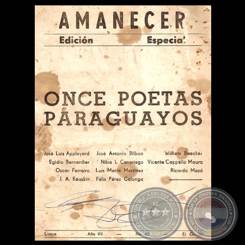 ESTE número extraordinario de la revista «Amanecer» es como un símbolo que se levanta entre los distintos grupos y tendencias culturales del ámbito nacional; es el reflejo de lo acontecido en una sola noche, noche en que la ciudad de Luque viviera un evento sin precedente en toda su historia desde el punto de vista del quehacer poético. La prensa nacional se hizo eco y todos tuvieron la oportunidad de integrarse en el primer recital de poesías con la participación de poetas de primera línea, quienes brindaron todo su arte con lo lectura de sus obras, que las páginas de nuestra modesta revista reproducen, como una sincera entrega a esta juventud que puebla los jardines de nuestra patria.
