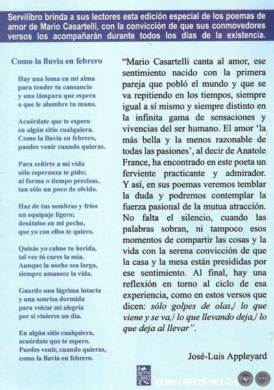 "Mario Casartelli canta al amor. Nada menos que al amor, ese sentimiento nacido con la primera pareja que pobló el mundo y que se va repitiendo en los tiempos, siempre igual a sí mismo y siempre distinto en la infinita gama de sentimientos, sensaciones y vivencias del ser humano.
