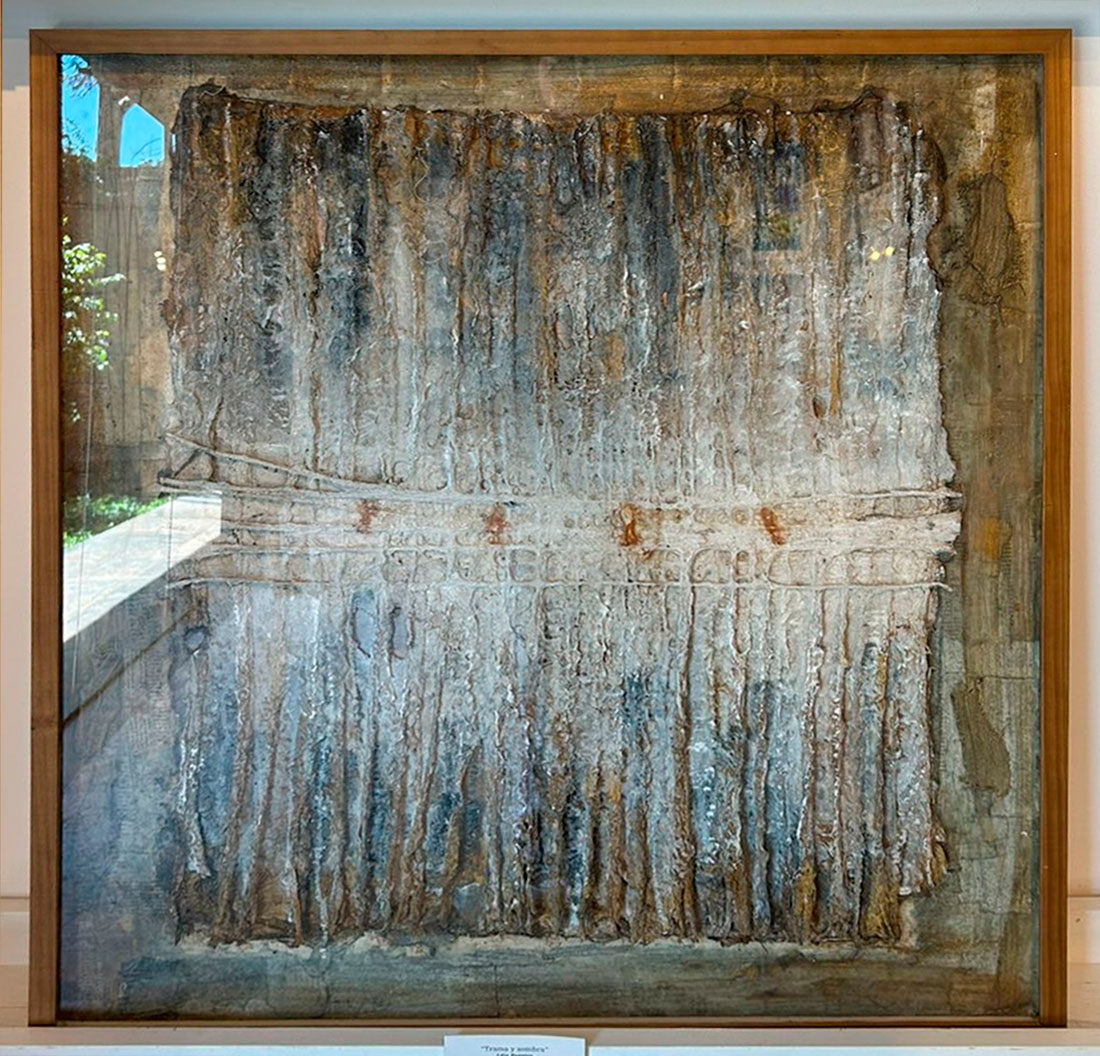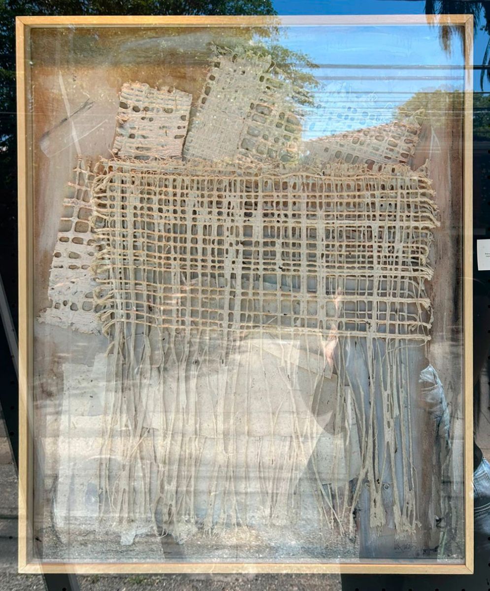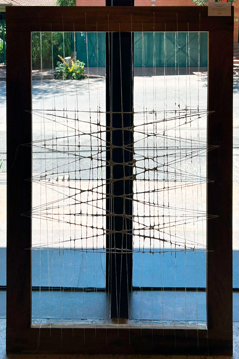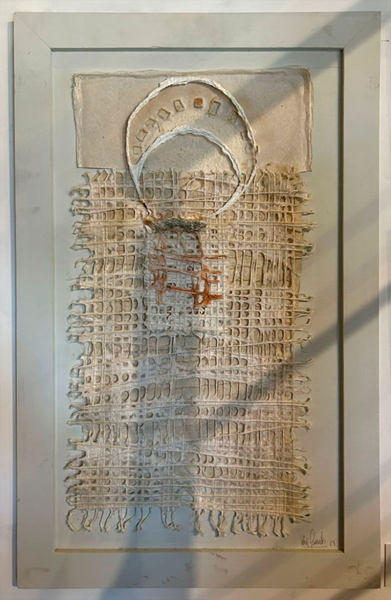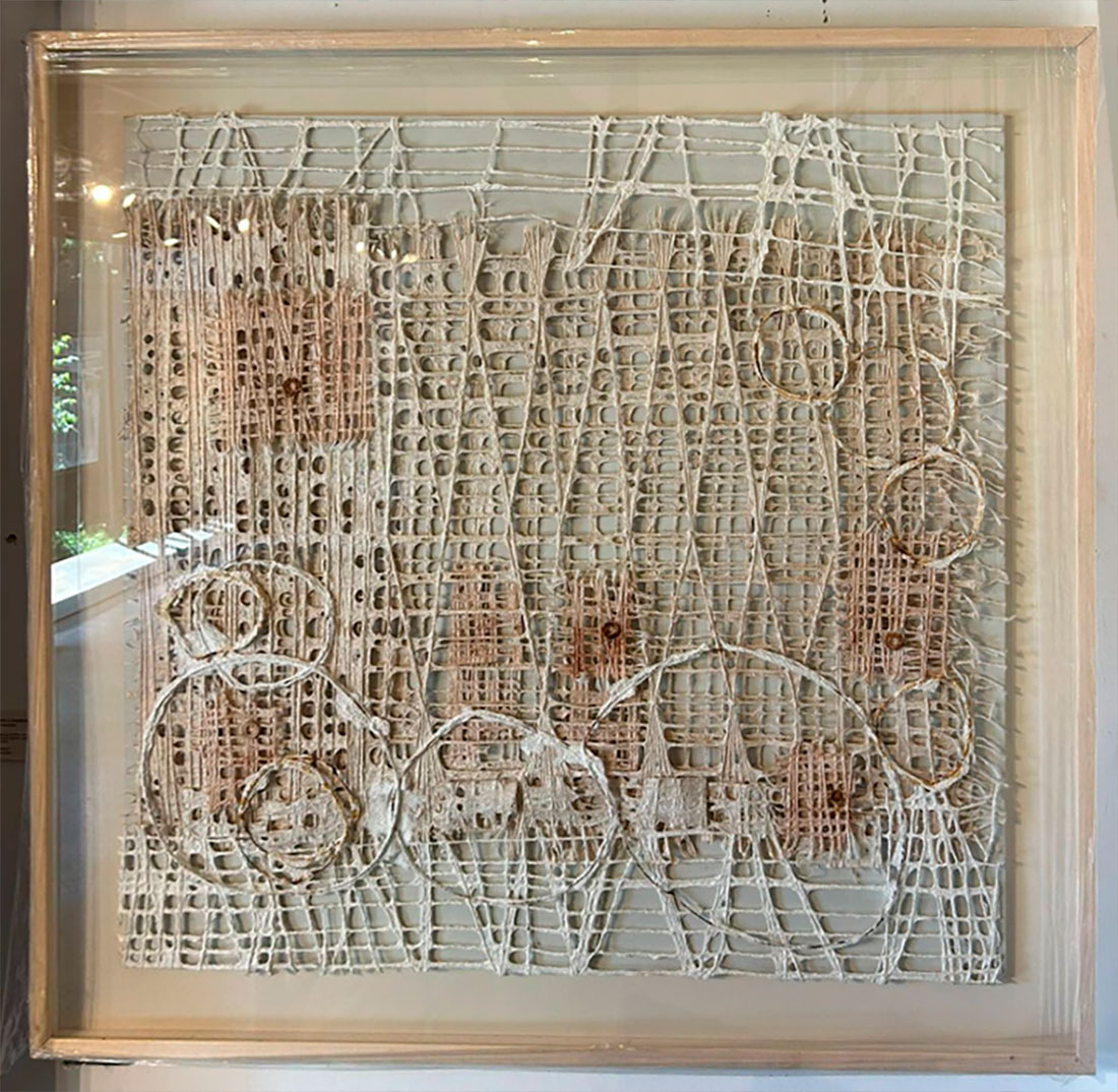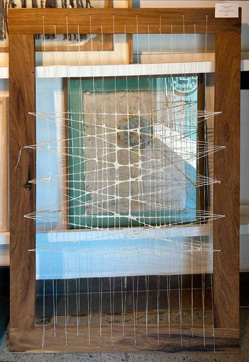 Obra hecha con hilos de seda pura paraguaya, pulpa de algodón blanqueado y marco de madera de palo rosa y aceite de lino.