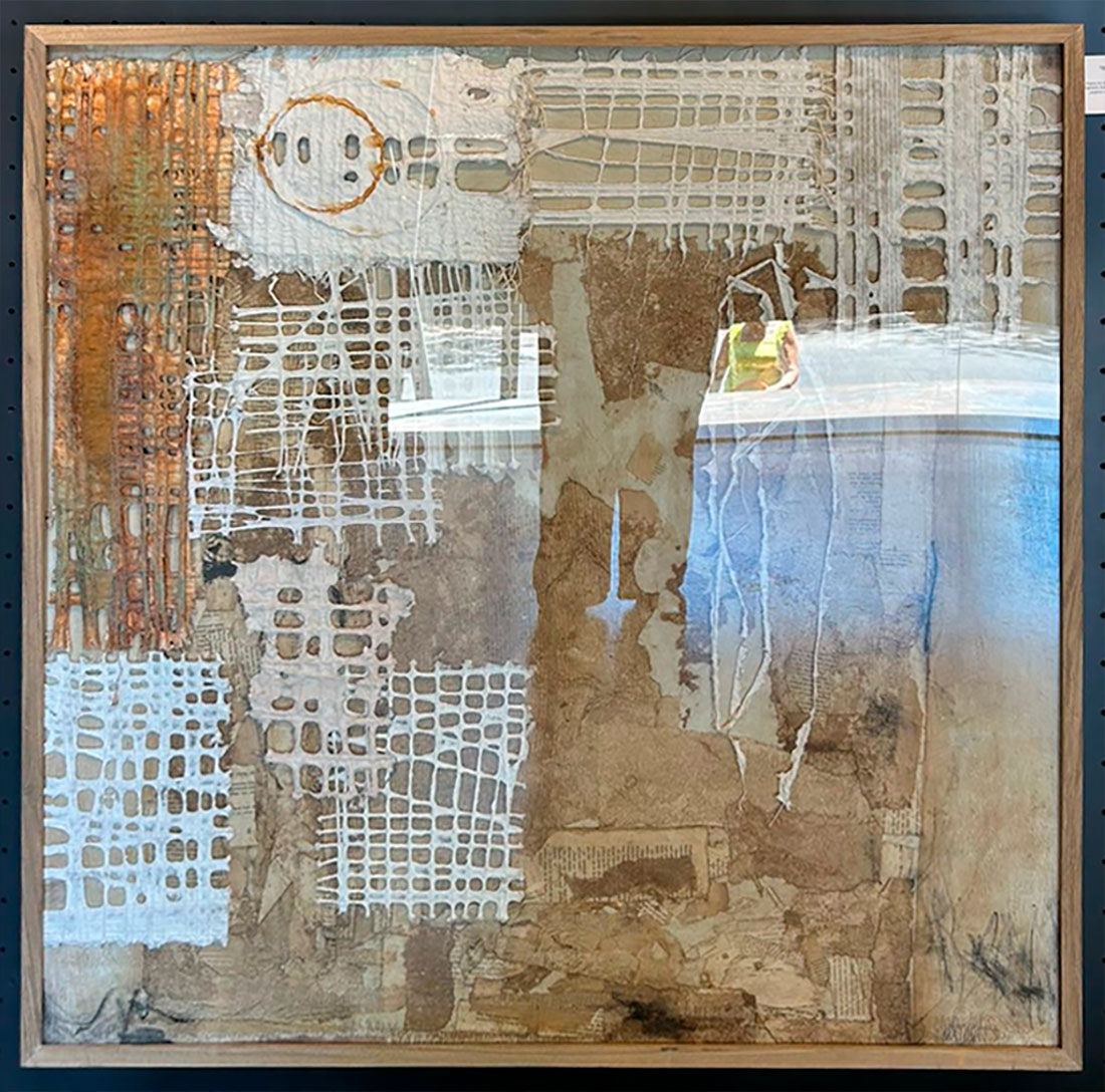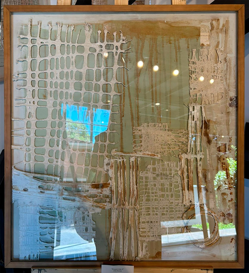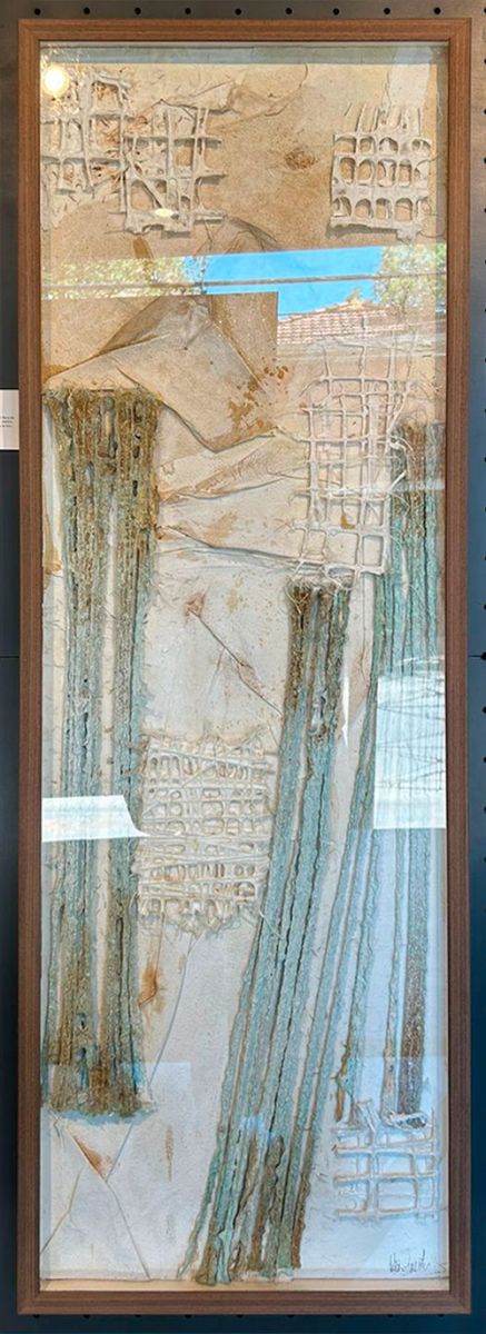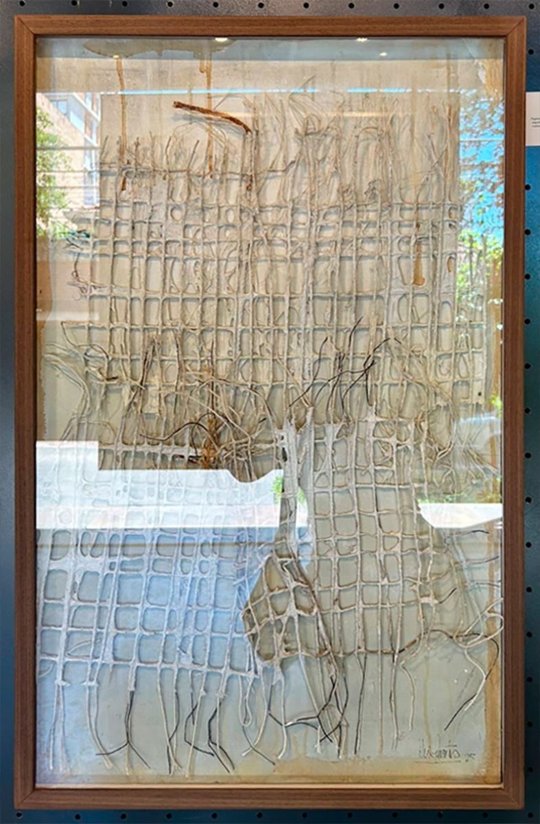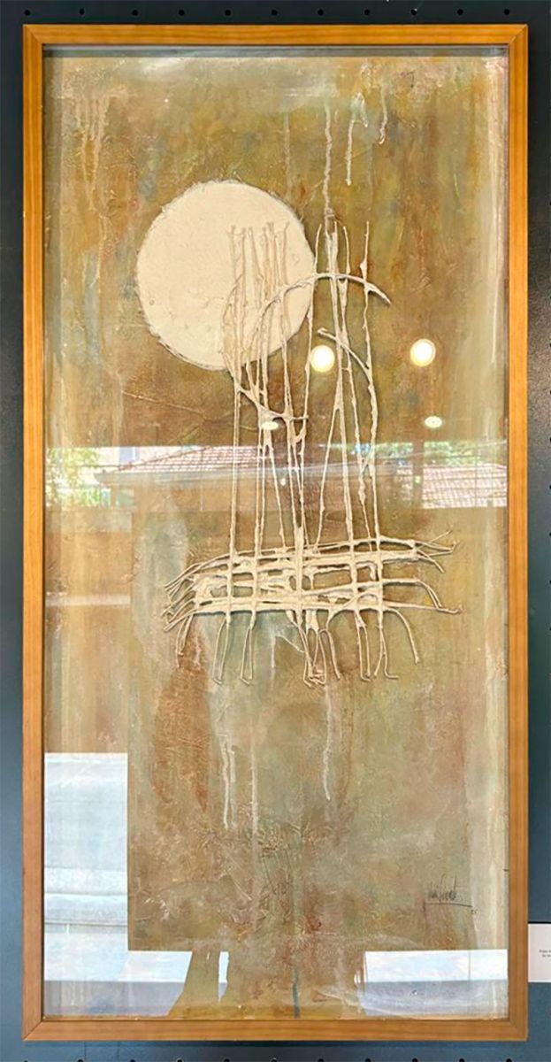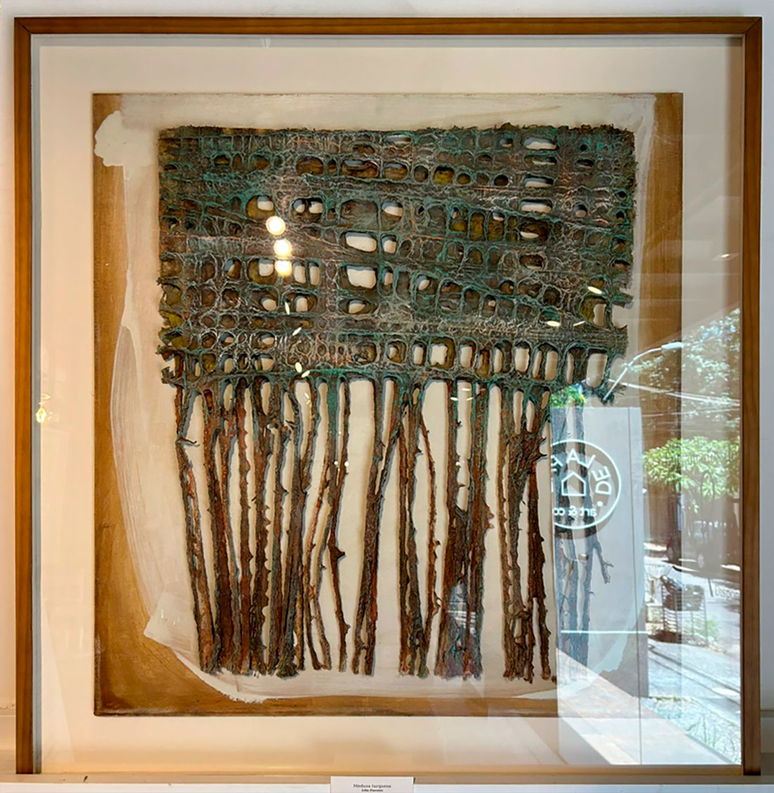 Obra hecha con hilos de seda pura paraguaya, pulpa de algodón blanqueado y marco de madera de palo rosa y aceite de lino.