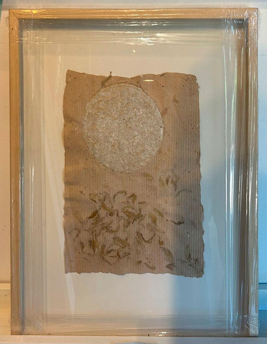 Papel reciclado, papel reciclado, algodón, luna con óxido y pintura a la tiza.