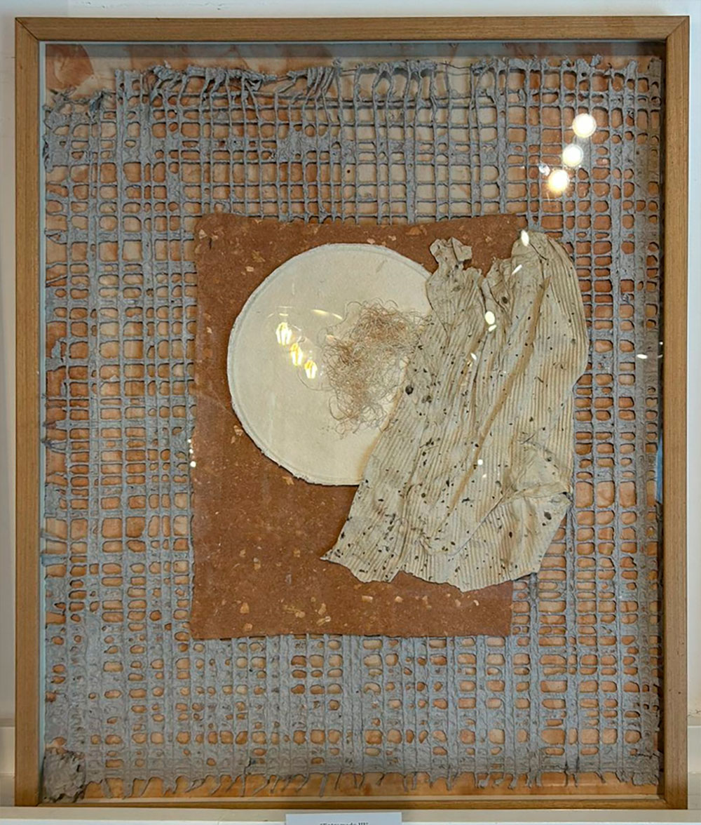 Pulpa reciclada con algodones, tramas de fibras puras, betún y pintura acrílica a la tiza.