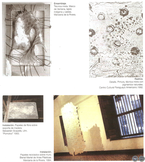 En 1990 realiza su primera exposición individual con la muestra que denomina “Rastro” en el Centro Cultural Paraguayo Americano, en cuyo catálogo el artista reflexiona así, junto a Beto Ayala: “Una mancha, una huella, signos/ algo que estuvo y ya no está/ La piel de un taguá secándose al sol/ La cáscara/ El viento/ La vida ausente/ El alma ausente/ La piel/ El rastro". Estos trabajos surgen a partir de la incidencia de la violencia cotidiana en el entorno vital que nos rodea. La inquietud que esta destrucción me produce encuentra en estas texturas, en estos cartones manchados, impregnados de rastros, el camino gestual para comunicarse. Reducir al mínimo los elementos que conforman una obra de arte resulta difícil. El arte no está separado de la vida cotidiana, en muchos casos un gesto manchando un cuerpo o una vasija nos llega como un rastro de vida, como un grito”... (1990).