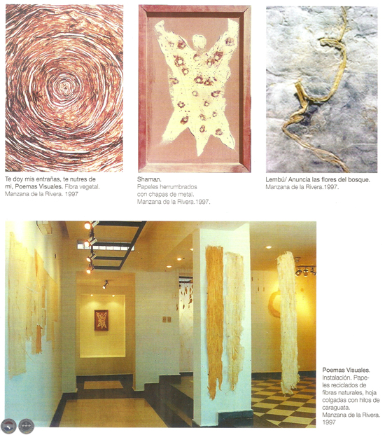Ya con las instalaciones de Gustavo Benítez, el espectador es envuelto en un espacio que recoge diferentes materiales, como papeles reciclados de fibras naturales, madera, metal, pintura al óleo, bleque, lacre y otros elementos como nidos de pájaros, capullos etc. Rodríguez Alcalá dice: Benítez ha experimentado con las posibilidades expresivas de las fibras artesanales; Con la incorporación a este soporte- que a partir de esto deviene protagonista el mismo- de material diverso; Sus papeles-cuadro- por denominarlos de alguna manera- registran operaciones sutiles de tono y textura, de inclusión de materia orgánica (texto escrito sobre la obra del artista s/f).