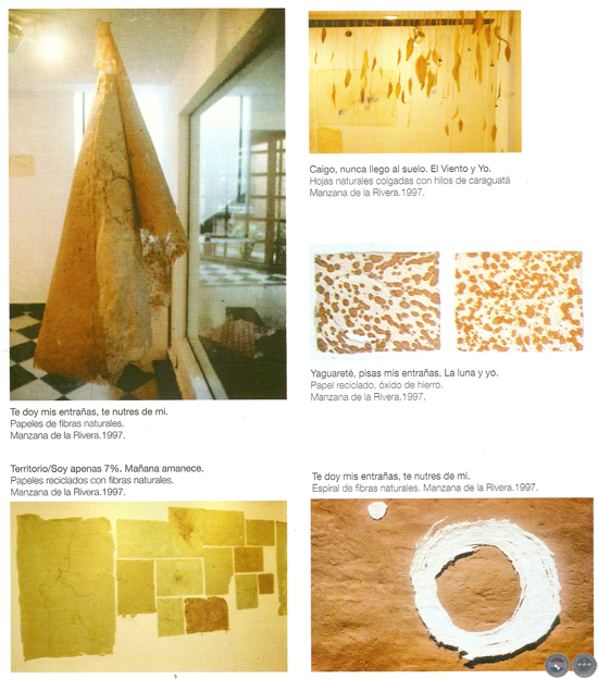 En la obra titulada “Territorio. Soy apenas el 7% hoy. Mañana amanece” utiliza sus papelesmembranas de varios tipos de texturas, donde pulsan fibras primordiales y laten incrustados semillas, hojas, pétalos, colores terrosos que suplen a las palabras para abrirse a la experiencia y transparentar el espacio sagrado de las selvas que claman por la reducción de sus recursos forestales y la depredación, por la secreta actividad creadora de la vida, donde resuenan los ecos por lo nativo, por las propiedades de las plantas, por los hábitos de los animales, por la pureza. Simples papeles que en el contexto de una Instalación y del arte, por voluntad del artista pueden remitir a las ausencias o crear espacios míticos de historias de amor entre hilos vegetales, aparición de deidades eólicas y desplegar fábulas.