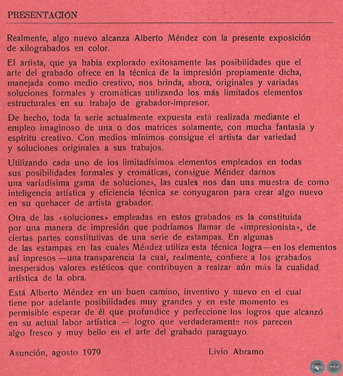 De todos modos, para mi es, sin embargo, motivo de sincera satisfacción presentar esta primera exposición individual de Alberto Méndez, un joven que está surgiendo como uno de los valores auténticos del grabado paraguayo contemporáneo.