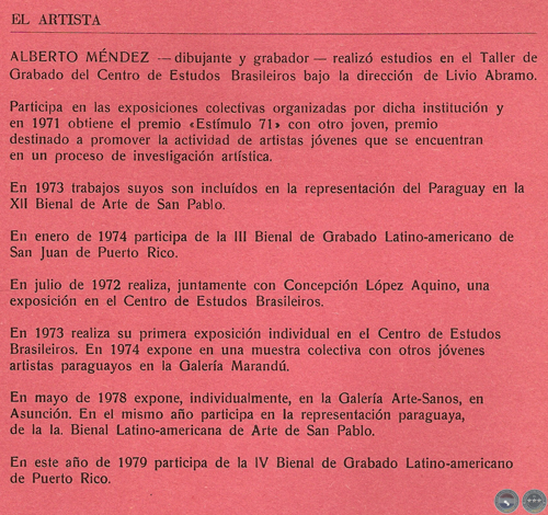 Alberto Méndez fue uno de los artistas paraguayos jóvenes actualmente elegidos para participar, por primera vez, en la muestra internacional de la XII Bienal de Arte Moderno de São Paulo, recientemente inaugurada en aquella ciudad. La presente es la primera muestra individual de Alberto Méndez en Asunción.