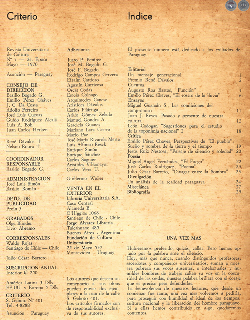 Justo P. Benítez / José M. Bogado G. / José F. Bogado / Rodrigo Campos Cervera / Efraím Cardozo / Agustín Carrizosa / Oscar Codas / Estela Colnago / Arquímedes Canese / Aristídes Dávalos / Carlos Filártiga / Atilio Gómez Zelada / Manuel Gondra A. / Graciela Guanes / Mariano Lara Castro / Mario Paz / José María Rivarola Matto / Luis Alfonso Resck / Enrique Símón / Enrique Sánchez / Carlos Saguier / Aristídes Villamavor / Carlos Vera U. / Guillermo Weiler