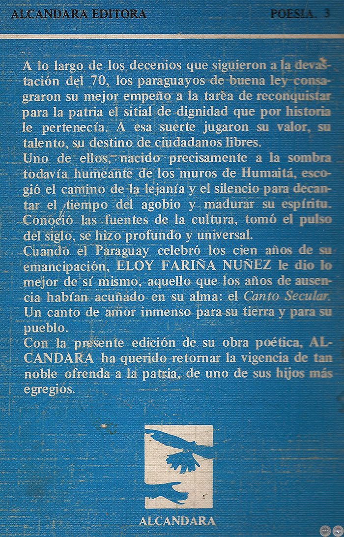 Voy a explicarme. Si alguno me demostrase y persuadiese alguna vez que el Canto secular, para lograr lo que logró, exigía de modo necesario la clase de verso que tiene, la invocación mítica con que comienza, los temas sucesivos que desarrolla y los que omite, concluiría luego riéndome a carcajadas de mi ingenuidad, porque ninguna de esas cosas puede demostrarse ni justificarse. Explicarse, es posible, fomentarse, también, pero jamás justificarle. Ahora bien, todos los demás poemas y textos en prosa del autor necesitan de esa justificación. Parece una barbaridad lo que afirmo, y puede que lo sea, pero es una desnuda verdad. Es posible un experimento imaginativo para comprobarla: basta con intentar suprimir el Canto secular de la memoria y la literatura paraguayas como si nunca hubiera existido, e intentar ver lo que ocurre.