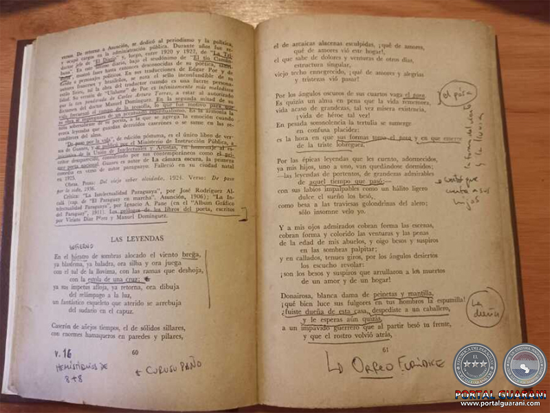 Si Poe canta en “Ulalume” al fantasma de la belleza que ha muerto, Guanes trae al “viejo caserón” de “Las leyendas” aquellos que corresponden al soldado muerto en batalla y su viuda, sobre cuyas muertes ejemplares se edifica la idea del ser paraguayo. Por lo tanto, la idea difundida por algunos historiadores de que Guanes no participa del proyecto político del novecentismo es al menos cuestionable. En cambio, ocurre un fenómeno singularísimo, un poema que podría ser tomado como una fina imitación del “Ulalume” de Poe –hablo de “Las leyendas”– encubre algunos símbolos esenciales del modernismo local. Dice Rodríguez Alcalá: “El dolor de sus padres no le era del todo indiferente”.