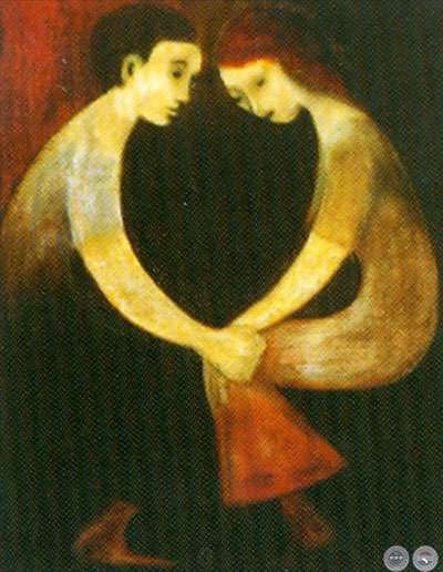“En este periodo se agrupan aquellas obras en las que aparece la figura masculina como protagonista o pareja de la protagonista. Envueltas en situaciones de ternura o de amenaza algunas y de agresividad otras. Técnicamente están realizadas a partir de manchas elaboradas con pintura al óleo y/o tintas de impresión, para luego ser retocadas escasamente con el fin de dar énfasis y destaque a las figuras”