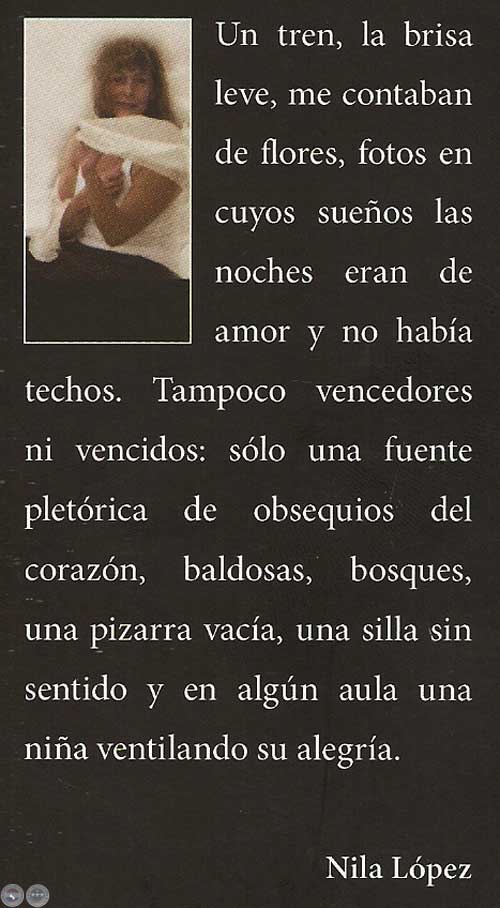 Un tren, la brisa leve, me contaban de flores, fotos en cuyos sueños las noches eran de amor y no había techos. Tampoco vencedores ni vencidos: sólo una fuente pletórica de obsequios del corazón, baldosas, bosques, una pizarra vacía, una silla sin sentido y en algún aula una niña ventilando su alegría.
