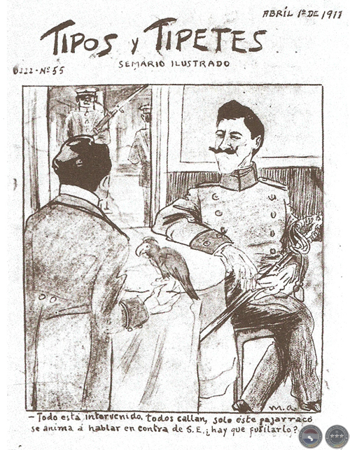 TIPOS Y TIPETES se presenta como un "periódico festivo humorístico" que cada sábado trae "páginas artísticas e informaciones interesantes". Pero, de hecho, presenta sobre todo agudos comentarios políticos e ingeniosas interpretaciones de la situación nacional. Con notable libertad, Acevedo hace la caricatura de su tiempo: los enfrentamientos en el Senado, lasanécdotas de los partidos políticos, los carnavales de comienzos de siglo, la particular versión asuncena de la belle époque, la mofa de la extravagancia de las últimas modas, las alusiones satíricas a personajes de la política y la vida social. Partiendo tanto del relato del suceso cotidiano y de la anécdota trivial, como del análisis de la coyuntura mundial o nacional, a través de apretadas caligrafías manuscritas, caricaturas rápidas y minuciosos dibujos "en serio", Acevedo da la versión de su época en un momento en que la pintura era practicada sólo como aséptica representación de paisajes sin historia. El dibujo suelto, las alteraciones formales que exige la sátira y el expresionismo que implica la exageración figurativa, permiten a la caricatura moverse con una libertad formal y una fuerza expresiva ausentes en el género pictórico de las bellas artes y le otorgan una vigencia y una soltura que le capacitan para expresar significados marginados por el arte académico de su época. El humor popular, las contradicciones políticas y sociales, el espíritu in-quieto del nuevo siglo, los temores y el asombro ante los avances tecnológicos y la amenaza de la guerra, aparecen con fuerza en estas hojas vivas, marcadas por la visión propia del protagonista, recreadas por su relato minucioso y personal. – PÁGINAS 335 y 336.