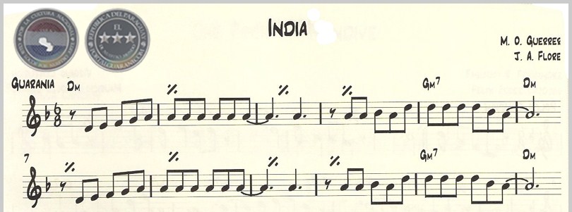 INDIA. Versión guaraní del poema original de Manuel Ortiz Guerrero. Esta versión data de la época en que realizábamos los trabajos de investigación en la Academia de la Lengua Guaraní. La escribió ElbaAgustina Odriozola (Ysaréma) en el año 1951 y se incluye en el apéndice de este poemario como un homenaje a su autora, por su larga lucha por la defensa y difusión de nuestra música nativa y de nuestra lengua autóctona.