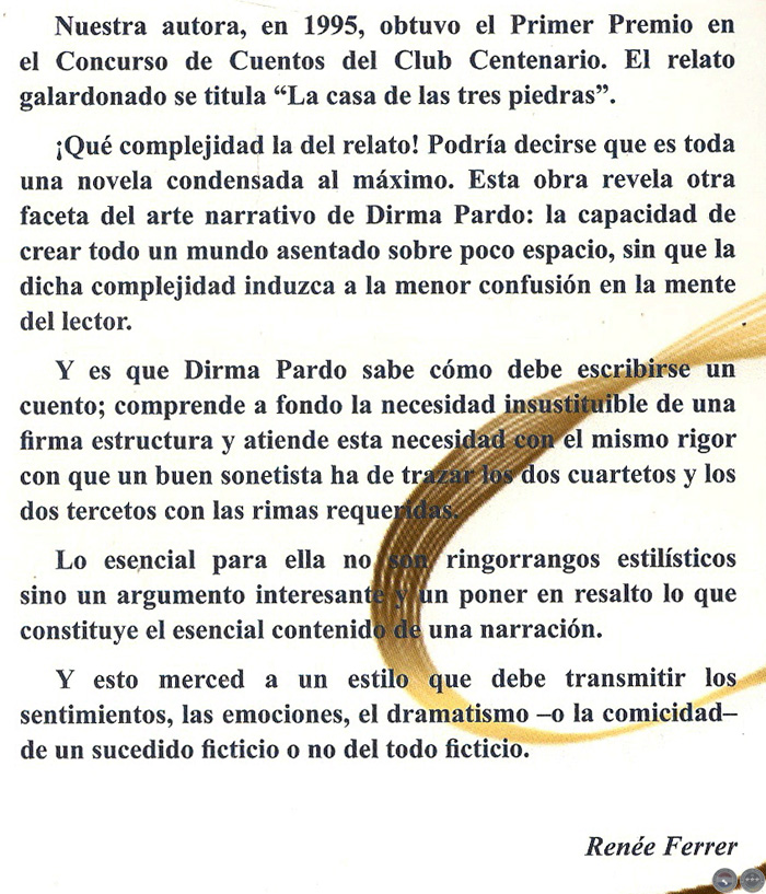 Nuestra autora, en 1995, obtuvo el Primer Premio en el Concurso de Cuentos del Club Centenario. El relato galardonado se titula "La casa de las tres piedras". ¡Qué complejidad la del relato! Podría decirse que es toda una novela condensada al máximo. Esta obra revela otra faceta del arte narrativo de Dirma Pardo: la capacidad de crear todo un mundo asentado sobre poco espacio, sin que la dicha complejidad induzca a la menor confusión en la mente del lector.