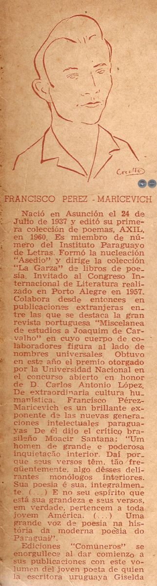 Toda poesía es toma de contacto con una realidad; no importa, a los fines de una verídica poesía, cuál sea esa realidad, a qué nivel se la busca -o se la encuentra-. Lo que importa es que ella, sea la que fuere, adhiera al subsuelo del ser, prenda su dinamismo configurativo en aquella zona insobornable de nosotros mismos donde desciende a asirse la oscura raíz del grito. Por olvidar esto tan simple, naufragó en convencional sonsonete o en retórica altisonante y vacía la mayor parte de los intentos líricos en él medio; en recordarlo a golpes de martillo sobre el yunque de una sensibilidad exacerbada trabajó la promoción del cuarenta, cuyo drama en busca de la expresión espera todavía su análisis fidedigno. Revalidar para uso nuestro esa verdad congénita de la poesía sigue siendo la pasión y la vocación de promociones posteriores. Por razones cuyo análisis a su vez sea, quizá, prematuro, es la promoción más reciente, la del 60, la que apresura sus pasos en pos de esa definición, buscando apoyo en la obra édita, la única que proporciona perspectiva eficaz. Francisco Pérez-Maricevieh, Miguel Angel Fernández y Roque Vallejos son la tríada representativa de una pasión y esa vocación. Pérez-Maricevich, en AXIL, colección breve de su producción adolescente, pareció ir a demorarse en el laberinto de motivaciones cuyos cimientos válidos echó la promoción decano del 40: la poesía objetiva, instrumental deliberado de un momento críticamente asimilado como responsabilidad del creador. Pero el joven poeta parece de pronto liberarse, para entrar en PASO DE HOMBRE, en una zona despejada de la poesía, donde el único mandato es la motivación interior, y en la que la intimidad dueña del ámbito desbroza de metáforas el camino para aproximarse clara y sencilla a la sensibilidad del lector. La riqueza imaginística, la profesión metafórica, características de este poeta, se esfuman de pronto, y el poema queda no sustento de metáfora, sino función de ella; una metáfora sola que es el poema mismo, a un tiempo forma y materia sacramentales: poesía de sensibilidad pura, cristal de emoción. Poesía desnuda que constituye no ya el hallazgo de la poesía nueva, sino la sustancia de la poesía eterna. Poesía ascética con su triple voto de obediencia a la urgencia interior, de pobreza externa, de castidad en el sentido de que es casta la desnudez de la verdad.
