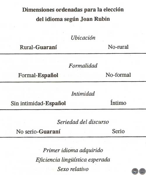 En su análisis del uso lingüístico en el Paraguay, Rubin utilizó las variables sociales descritas por Brown y Ford (1961) y por Stewart (1962) y las dimensionalizó del siguiente modo: (a) ubicación, (b) formalidad, (c) intimidad, (d) seriedad de la situación y (e) sexo relativo. “Las dimensiones intimidad y sexo relativo se refieren a la relación entre los dos individuos que toman parte en una conversación. La seriedad de la ocasión y la ubicación se refieren al marco ambiente. La dimensión de formalidad puede referirse al ambiente o al tipo de identidad social entre los interlocutores. Las dimensiones no se suman para determinar el uso sino que operan en un orden jerárquico” (Rubin, 1974:155). La influencia de estas dimensiones en la elección de la lengua apropiada a la situación, puede, sin embargo, en el Para-guay, Ser alterada por otros cuatro factores aleatorios: la habilidad lingüística del interlocutor, el primer idioma adquirido por la persona que habla, la presión de la escuela y los cambios operados en la situación social del individuo a través del tiempo. El cuadro siguiente muestra la interacción de las dimensiones en la elección de la lengua: