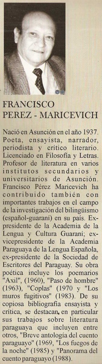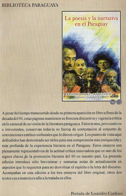 [b] Tanto lo que aquí se dice como lo dicho más adelante sobre Fariña Núñez no refleja apropiadamente la importancia de este poeta en el proceso del desarrollo estético de la cultura paraguaya. El perfil polémico del texto no ha hecho justicia a los grandes méritos del notable poeta humaiteño. Una estimación más justa sobre este autor puede encontrarse en los estudios previos a EFN: Obra poética, Alcándara, Asunción, 1982, y Poesías Completas y otros textos. El Lector, Asunción, 1996.