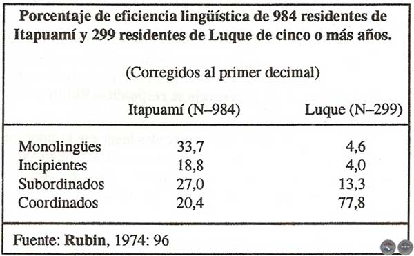 No obstante estas dificultades, y utilizando una medida subjetiva de eficiencia, Rubin pudo medir algunos cambios operados “en el carácter bilingüe de la comunidad”. Para realizarlo, la investigadora recurrió a dos procedimientos, cuantitativo el uno, cualitativo el otro. Por el primer procedimiento, Rubin dividió a los individuos de su muestra por grupos de edad, diferenciándolos por áreas, y comparó su habilidad bilingüe. Esto le permitió comprobar un considerable aumento en la eficiencia bilingüe por parte de los individuos rurales de 17 a 40 años en comparación con los de 41 años y más. La conclusión que Rubin extrajo de su análisis comparativo de esos dos grupos de edad fue que el número de los monolingües se ha reducido en un 100%, mientras que los bilingües coordinados han aumentado en más del 100%. El fenómeno se aprecia aún mejor comparando los porcentajes totales de las categorías monolingües e incipientes y las de subordinados y coordinados que, para el grupo de 17-40 años, da 34,4 para los primeros y 64,7 para los segundos, mientras que para el de 41 años y más las frecuencias relativas alcanzan a 57,5 y 41,4 respectivamente. En el centro urbano, por su parte, la reducción de monolingües fue de 200% y de 20% en el aumento del número de los bilingües coordinados. Tales cifras, concluye Rubin, hacen evidente que, en el espacio de una generación, los habitantes rurales (de Itapuamí) han efectuado un cambio a favor de una proporción mayor de bilingües en su comunidad. En lo que concierne al centro urbano, Rubin observó los siguientes cambios: