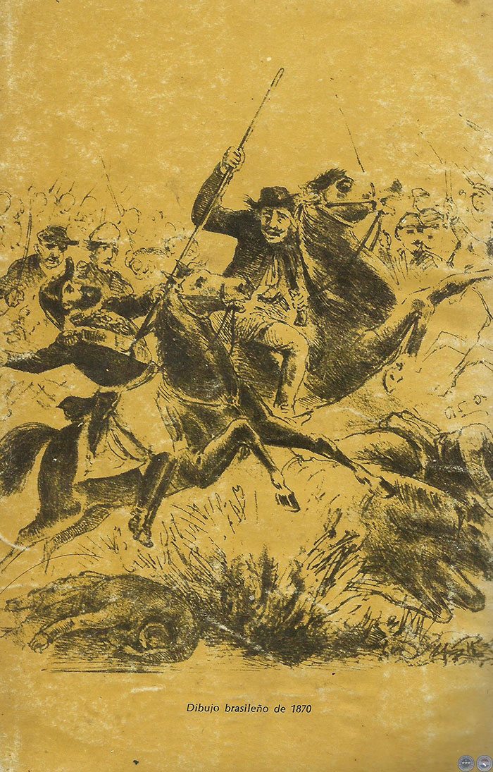 Durante la rendición de los de Humaitá aconteció algo notable: uno de los que se rendían, abandonó, de pronto, a sus compañeros, se precipitó, como loco, sobre uno de los nuestros y lo abrazó, lo besó y no quiso desprenderse de él: era un sargento de la artillería de la fortaleza. Resultó, sin embargo, que este sargento era una sargenta en uniforme de artillero y que había participado del sitio en la fortaleza de Humaitá. Nuestro compañero, un paraguayo, resultó ser su marido y luchaba, como prisionero, contra el odiado tirano López, como él lo llamaba. En realidad, debió de haber habido todo un batallón de prisioneros y desertores paraguayos que, al mando de los brasileños, combatían contra López. Esta valerosa sargenta pudo vivir con su esposo, haciendo de lavandera del batallón, y siendo la única mujer en el campamento. Se sabía que López había advertido al mariscal Caxias que “si no tuviese más hombres para la guerra, tomaré mujeres”. Se hablaba acerca de compañías femeninas, que López utilizaba para la excavación de trincheras, fabricación de pólvora, abastecimiento de comida y leña para el ejército y aún para combatir. Después de la caída de Humaitá Caballero intentó nuevamente romper el cerco de Timbó; pero los brasileños en esta ocasión mataron en las lagunas a unos 1.500 — 2.000 paraguayos, aproximadamente. Un paraguayo nunca se rendía; no daba y no pedía perdón (lo mismo hacíamos nosotros). Esa acción fue un infernal baño de sangre realizado muy cerca de nosotros. Caballero pudo, sin embargo, alcanzar a su amigo López: su capacidad para escaparse de situaciones difíciles me hacía recordar siempre a Garibaldi. Luego de estos acontecimientos fuimos, a mediados de agosto, destacados a Humaitá, donde no encontramos sino balas de cañón sin pólvora. Destruyéronse todas las fortificaciones y baterías situadas sobre el río, que los mismos paraguayos no destruyeron echándolas al agua. La iglesia, el hospital, la casa del mariscal-presidente y todo lo que debió ser edificios y cuarteles, estaba en ruinas. Luego transcurrimos los días subsiguientes con ejercitaciones de batallón y de división. El servicio de reconocimiento en los pantanos era menos agradable y aceptable que aquéllos.