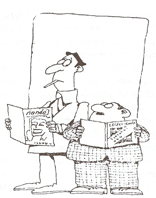 Igual cosa habrá de hacerse con la literatura. Quien compre un libro extranjero, tendrá que comprar uno de autor paraguayo. Si no encuentra un título diferente, pues que compre dos o diez del mismo autor, y que lo lea diez veces. Así, en una biblioteca de dos mil volúmenes deberá haber cien ejemplares de "Yo, el Supremo", cincuenta o cien de "Hijo de hombre", treinta de "La babosa", etc., para tener derecho a adquirir, usar y leer otros libros exóticos. Además, para enterarse de lo que trae "Selecciones", deberá leerse primero "Ñandé"; si se quiere leer después "Condorito" o "Tarzán de los monos", habrá de leerse otra vez "Ñandé"; si se insiste con "Nocturno" u otra, deberá leerse una vez más "Ñandé", y así sucesivamente con todos los libros y publicaciones, lo cual incentivará también todas esas revistas que editan las oficinas públicas como única manera de promocionar a sus jefazos.