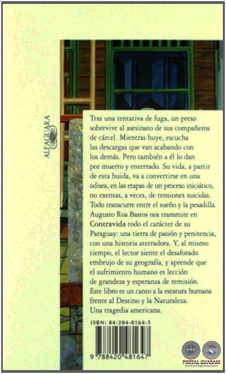 Tras una tentativa de fuga, un preso sobrevive al asesinato de sus compañeros de cárcel. Mientras huye, escucha las descargas que van acabando con los demás. Pero también a él lo dan por muerto y enterrado. Su vida, a partir de esta huida, va a convertirse en una odisea, en las etapas de un proceso iniciático, no exentas a veces de tensiones suicidas. Todo transcurre entre el sueño y la pesadilla. Augusto Roa Bastos nos transmite en Contravida todo el carácter de su Paraguay: una tierra de pasión y penitencia, con una historia aterradora. Y, al mismo tiempo, el lector siente el desaforado embrujo de su geografía, y aprende que el sufrimiento humano es lección de grandeza y esperanza de remisión. Este libro es un canto a la estructura humana frente al Destino y la Naturaleza.