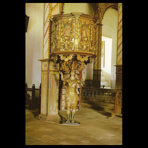 El púlpito merece un párrafo especial debido a sus especiales características de tamaño natural. Se ha pensado que se trata de Sansón. Josefina Plá presenta el hecho como una posibilidad: "Se apoya en una figura masculinade rasgos adolescentes a la cual se ha querido dar las más distintas interpretaciones, viendo en ella las más de las veces un ángel, para lo cual le faltan las alas; no es sino una simple figura de las que abundan en el barroco a no ser que se haya querido representar en ella a Sanson” (7).