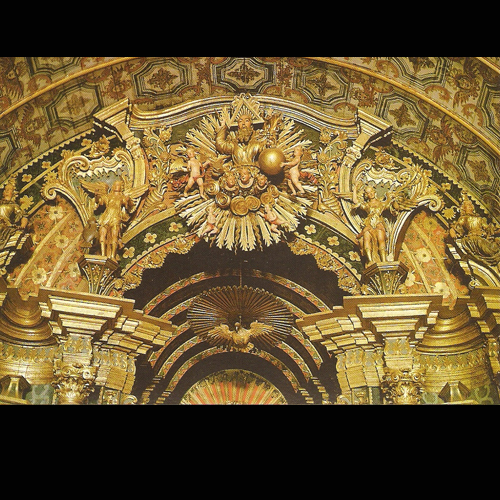Según aquella interpretación, el retablo era utilizado por los misioneros como una manera de introducir a los indígenas en los principios de la religión. En la parte superior está el Padre Eterno, reinando sobre la Creación. Allí están simbolizados los cuatro elementos constitutivos de la naturaleza: agua, aire, fuego y tierra. Y un poco más abajo, dos figuras que simbolizan la Gloria y la justicia.