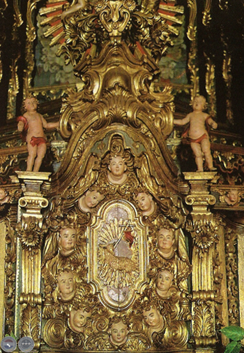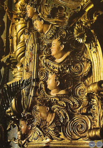 Ya sobre la mesa del altar, se encuentra el tabernáculo que es de un tamaño imponente, rodeado de cabezas de ángeles que surgen en medio de volutas, y sobre la puerta propiamente dicha, el simbólico Cordero.