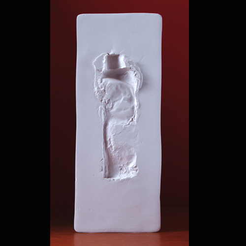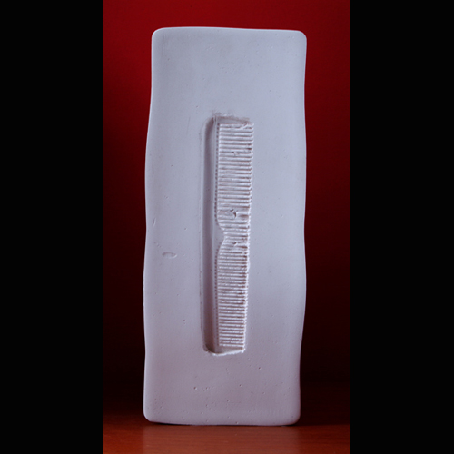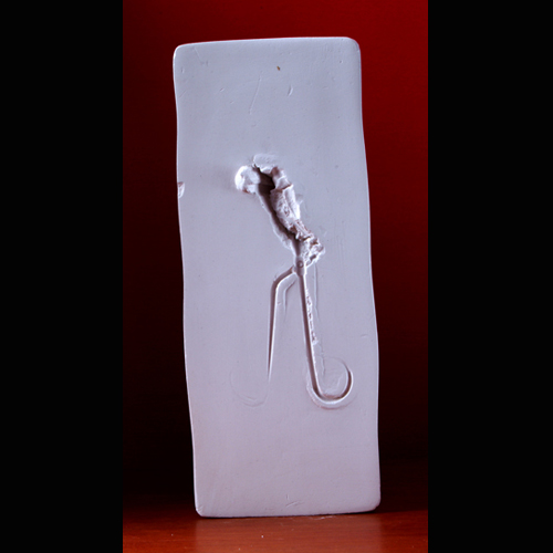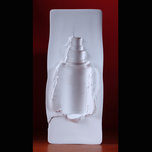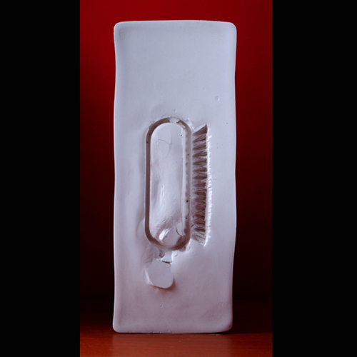 "(...) La marca (I). Los objetos rutinarios impresos por Bettina Brizuela ya no son ellos mismos sino su huella, su marca, su ausencia vuelta señal de su propio ser en retirada. Han sido impresos en lingotes de yeso y desprendidos luego. Y lo han sido en forma violenta: incrustados con violencia y con violencia arrancados. Sus imágenes no son sólo el sello de un objeto estampado sino las señales de un despojo y una herida: deformadas, aplastadas, presentan en sus rebordes hinchados, sus fracturas y sus cráteres, los estigmas de un apremio arbitrario. -- La marca (II). Impresos en yeso, los objetos han perdido sus etiquetas, los rótulos comerciales. Han perdido sus nombres, aquellos que los asignaba un empleo y un valor de marca. Ahora ya no se sabe se esta incisión desbordada corresponde a la presión de un cuchillo o una navaja y, lo que es más grave, no se sabe la cotización que refrenda el logo. Pero, también, se desconoce la firma, la corporación responsable de su diseño y su estilo, los poderes de su insignia publicitaria. Se ha borrado la distinción que confiere la propaganda, el aura que acuña el mercado. Desmarcada, anónima, cada cosa ya no puede hablar de sí: remite a otra cosa. Muestra el vaciado de una función fantasmática. Restituye, fugazmente, la inocencia original de un uso privado. -- La instalación. Los objetos, sus ausencias, están presentados sobre mesas largas y delgadas, pura madera despojada de todo lustre y ornato. Así exhibidas, las blancas placas de yeso despiertan el tono lapidario y un tanto luctuoso que convoca el mármol, convocado a su vez en su recuerdo por la pasta polvorienta que incauta su lugar solemne. Así ordenados, clasificados según un orden ignorado y sobre largas mesas idénticas, los trozos sugieren el trazado taxonómico de un laboratorio demasiado aséptico y la habitación entera evoca un espacio esterilizado y quirúrgico. En su centro, el yeso recuerda sus cometidos primeros, deviene ortopedia que apuntala el secreto de cada objeto destinado al hacer humano y corrige la distorsión fetichista de las marcas. Restituye el "estar a mano", carácter que, según Heidegger, adquieren las cosas en el círculo extraño del sentido".