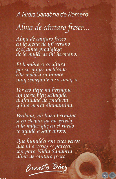 El agua tampoco tiene camino, va conformando su propio camino, y es conformado también por los altibajos geográficos, deja rastro en la piedra, en la arena que arrastra, en el tumulto de hojas que la besa, en el pez que la habita, en el pájaro que la observa, en el cielo que la refleja, el agua construye su memoria en el devenir de las cosas, y Nidia Sanabria de Romero, hace lo mismo, deja memoria en las cosas, en los seres que la poblaron, y esas cosas y esos seres son la memoria de ella, y lo más milagroso es que su memoria no está en su cabeza sino en el aire que su corazón acuna.