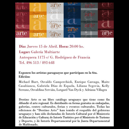 La publicación uruguaya “Destino Arte” presenta por primera vez en Paraguay su 6ª edición con una muestra colectiva de los artistas paraguayos que integran esta publicación. Este libro catálogo, cuya labor principal es difundir el arte de la región, ya ha sido lanzado en diciembre del año pasado en Punta del Este, Uruguay.