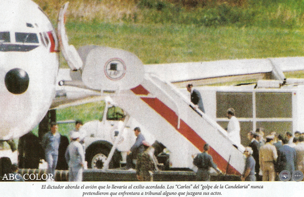 Al anochecer y el amanecer del 2 y 3 de febrero de 1989 -días de la Virgen de la Candelaria y de San Blas, respectivamente- se produjo el golpe de Estado que derrocó al Gral. Stroessner. El movimiento, encabezado por el Gral. Andrés Rodríguez, comandante de la Caballería, se había iniciado en la noche anterior con el apoyo de la Armada, al que se plegaron otras unidades militares poco después. Stroessner se refugió en el Regimiento Escolta Presidencial, donde resistió con sus leales hasta las primeras horas del 3 de febrero en que fue intimado a rendirse. Los generales -varios de ellos coroneles en el momento del golpe- que hicieron posible la caída del régimen se identificaron con el nombre de "Carlos".