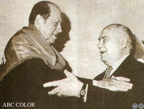 En la imagen, Stroessner seabraza con el Dr. Sabino Augusto Montanaro,