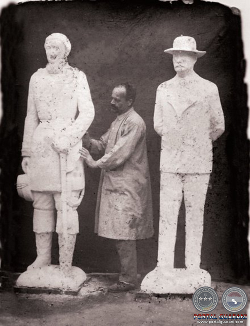 El escultor junto con dos de sus creaciones: la de la derecha es una estatua de Don Lázaro.