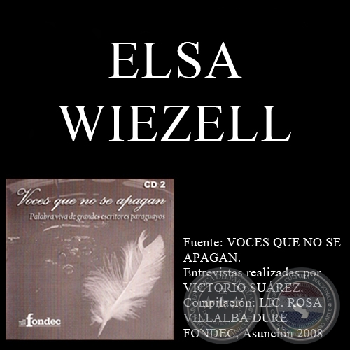 (Asunción, 1926). Poeta y pintora. Pertenece a la promoción del 50 y es hasta el momento la escritora que más libros ha publicado. En su juventud formó parte del grupo de intelectuales agrupados en la Facultad de Filosofía, donde obtuvo la licenciatura en dicha carrera universitaria. Sus poemas fueron estudiados por destacados críticos internacionales como Charles Richard Carlisle y Norma Suiffet. Esta última había referido lo siguiente: "Ha estructurado un estilo sin precedente. Un recurso nuevo que surge por vez primera en las letras de habla hispana. Tal vez algunos de sus libros sean excesivamente cerebrales. Tal vez haya una exuberancia técnica no compensada con un sentido poético estricto. Mas ello se equilibra con enfoques excelentes, algunos vibrantes de sentido poético y hasta de emoción en sus diferentes creaciones. Nuevo estilo para ternas clásicos: la angustia del hombre por la vida, la muerte corno trascendencia lítica". Por su parte, Carlisle hace hincapié apuntando el tesonero trabajo de la poetisa con estas palabras: "La poesía -el ser poeta- es una misión para Elsa Wiezell, pues escribe durante más de treinta años porque la poesía es su vocación, su búsqueda vital de la expresión plenamente realizada de la condición humana en todas sus facetas". Las obras de Elsa Wiezell fueron también reconocidas por prestigiosas publicaciones. En 1959 la Selección Artística Americana de Montevideo la nombra en "Valores de América", Igualmente, sus poemas aparecen en "Los mejores líricos Hispanoamericanos". En 1967 obtuvo el "Premio García Lorca" de Amigos del Arte y fue fundadora del Museo de Arte Moderno de Asunción. En 1970, en "Poetas del Mundo" aparece su nombre como representante de la poesía paraguaya. Asimismo, ocupa un lugar corno Miembro de Honor en The National Foreing Languaje. Capítulo Southwest Texas State University (EE.UU.). En 1992 recibió el Premio Integración Regional. Entre la impresionante cantidad de publicaciones que concretó Elsa Wiezell figuran los siguientes libros: "Poemas de un mundo en brumas" (1950), "Barro de estrellas" (1951), "Tronco al cielo" (1950), "Poema ciego" (1956), "Por las calles de Cristo" (1961), "Orbita de visiones" (1962), "El canto y la luz" (1964), "Tiempo de amor" (1965), "Temblor de acacias" (1966), "Mensaje para hombres nuevos" (1966), "Palabras para otro planeta" (1967), "Eco tridimensional" (1968), "Puente sobre el Tape Cue" (1968), "Sembradores del sol." (1970), "Virazón" (1972), "Pobladores fieros" (1974), "La cosecha del viento norte" (1974), "El amor en la brisa del sur" (1975), "El duende fugitivo" (1976), "Antología poética" (1982), "Corceles de alborada" (1.990), "El colibrí de la quebrada" (1991), "Poemas del aire profundo" (1992), "Escorzo poético" (1992), "La tierra de los maizales" (1994),"Los dos y el mar" (1994), "Rumbo al arco Iris" (1995), "Memoria de amor efímero" (1996), "Canto libertario" (1997), "Temblor de acacias" (5a. Ed. 2003), "El hombre en la nube" (2003), "Barranco" (2004), "Del amor al olvido" (2005), "Canto entre las piedras" (2006). Como artista plástica realizó una exposición de pintura-instalación en "La Casa de la Cultura de la Costa" de Montevideo, Uruguay.
