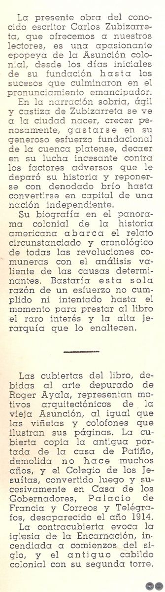 El volumen que ahora ve la luz comprende la etopeya de la ciudad durante la era colonial, desde su fundación hasta los sucesos que culminaron con la emancipación del antiguo dominio español para convertirlo en república independiente. Existe el propósito -que no sé si veré realizado- de publicar un segundo volumen con la etopeya de la Asunción republicana hasta los días heroicos de la guerra del Chaco.