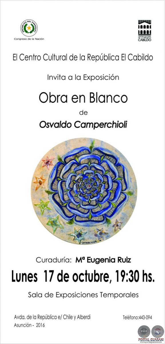 La muestra del artista Osvaldo Camperchioli tendrá su apertura este lunes 17 de octubre, a las 19:30, en la Sala de Exposiciones Temporarias del Centro Cultural de la República El Cabildo (Avda. de la República entre Chile y Alberdi). La exposición denominada “Obra en blanco” permanecerá abierta al público hasta finales de este mes y podrá ser visitada de 8:00 a 20:00, de lunes a viernes, y de 9:30 a 17:30 los fines de semana y feriados. El acceso es libre y gratuito. El CCR Cabildo cuenta con servicio de guías.