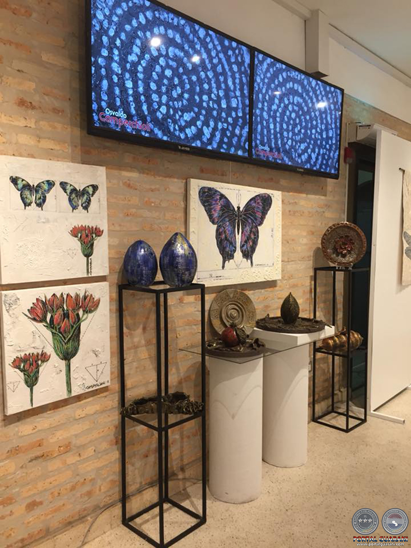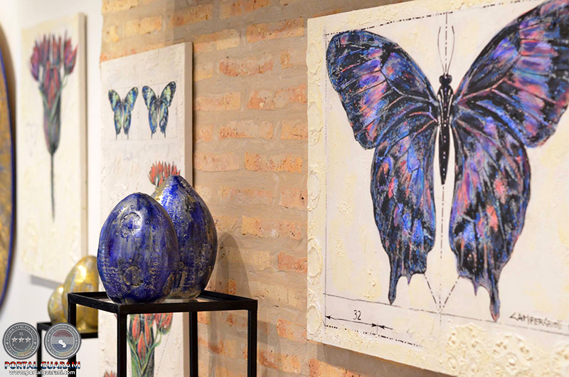 Camperchioli nos presenta pinturas realizadas con técnica mixta además nos trae figuras en cerámica esmaltada, las obras están inspiradas en la naturaleza y destacan la geometría que pone de manifiesto la armonía del conjunto, conformado por animales, vegetales y todo lo que representa la naturaleza.