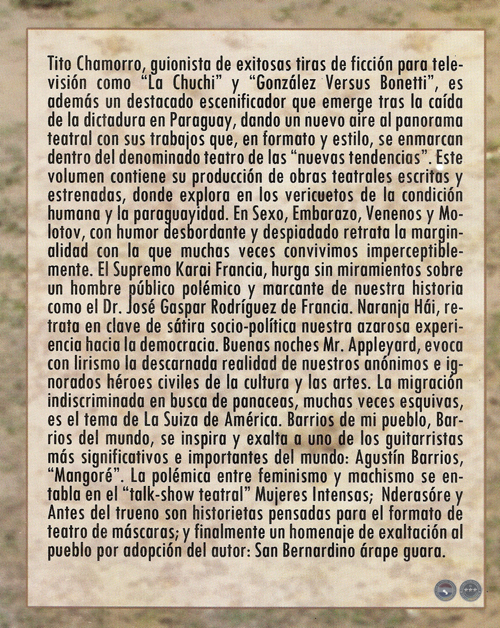Desde que tengo memoria, el lamento mayor de nuestros grandes directores, era la ausencia de una nueva nutriente de la dramaturgia paraguaya. Por aquel tiempo, nos habíamos quedado con Halley Mora como el mejor y el más prolífico, Alcibíades González Del Valle como el más polémico de nuestro tiempo, junto con algunas apariciones considerables como Ovidio Benítez Pereira, Antonio Escobar Cantero, Moncho Azuaga, Edda de los Ríos y otros que pueden ser víctimas de mi frágil memoria. De los mencionados, nos perduran Alcibíades, Ovidio y Moncho. Por suerte han venido surgiendo nuevos nombres, aunque la carencia de dramaturgos no ha sido salvada. De manera que la aparición en escena de Tito Chamorro como autor, con un volumen que incluye una decena de piezas de diversas exigencias, es un bálsamo para los directores exigentes que, por no hallar las obras en nuestro entorno, siguen echando mano a autores foráneos, con la consiguiente carencia de un teatro que nos refleje tal cual somos los paraguayos.