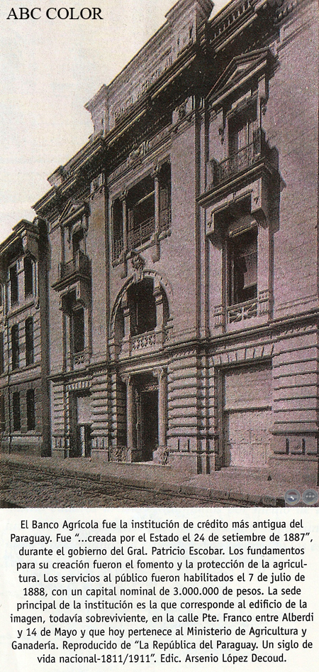 El 24 de setiembre de 1887 se funda el Banco Agrícola del Paraguay con un capital de $ 200.000 de curso legal. Otros bancos creados en ese período fueron: El Banco Nacional, Banco de Comercio, Banco Mercantil (1891), Banco de la República (1907), el Banco de España y Paraguay. Todos ellos de efímera existencia, aunque muy agitada por las circunstancias tan especiales que vivía el país en las postrimerías del siglo XIX y principios del presente.