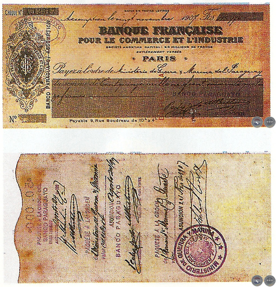 Ministerio de Guerra y Marina del Paraguay y el endoso fue realizado por el Sr. Guillermo de los Ríos.